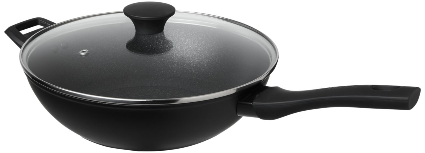 > Aus geschmiedetem Aluminium > Mit geometrischer Antihaftbeschichtung > Soft-Touch-Griffe aus Kunststoff > Glasdeckel mit Dampfaustritt > Für alle Herdarten und Spülmaschine geeignet > Größe ca. Ø 28 x 5,6 cm | je