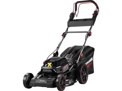 Prémium, nagy teljesítményű önjáró fűnyíró, kefe nélküli motorral Robusztus acéllemez-ház oldalkivetővel Két választható fűnyírási üzemmód (Auto/Eco) Központi 10 fokozatú vágásmagasság-beállítás, kb. 25-100 mm Vágásszéle