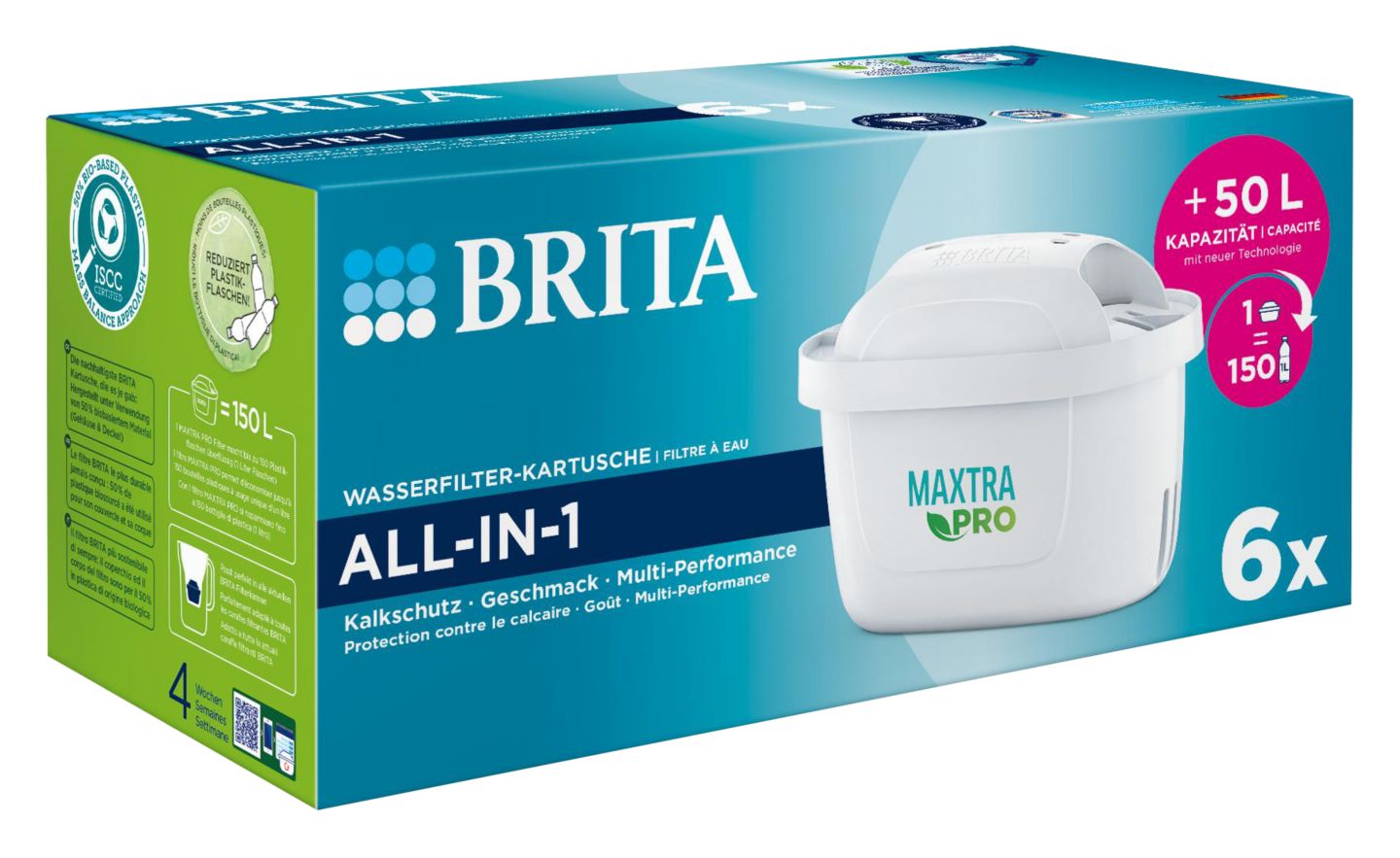 > Neu entwickelter Powerfilter > Gehäuse aus zu 50 % biobasiertem Kunststoff > Höchste Filtrationsleistung > Maximale Chlorreduktion > Für alle BRITA-Systeme (außer CLASSIC) > Kartusche reicht für 150 l bzw. 4 Wochen | je 6-St.-Packg.